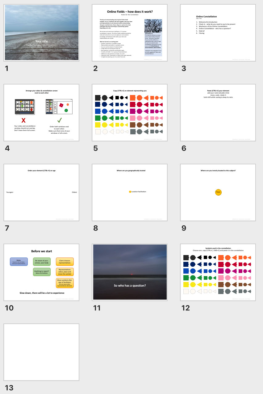 We assume you know how to facilitate a 1:1 or group constellation in person. The Online Fields method provide the tools and instructions so you can apply your own systemic knowledge and facilitation skills while your client and representatives are remote. The tools we recommend and use are technology standards like Powerpoint, Google Slides, Miro for the interaction and Zoom, Microsoft Teams, Skype and/or an ordinary phone line for communication.